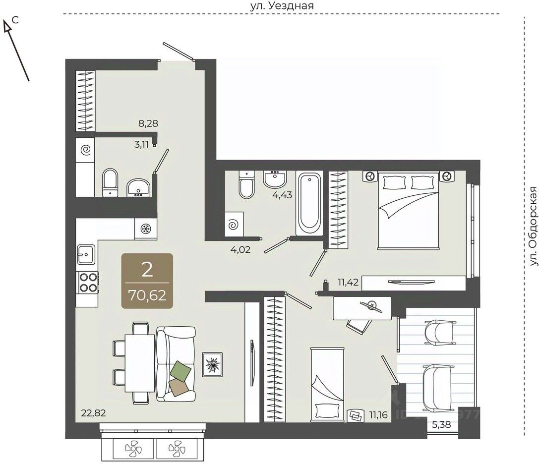 2-комн. квартира от застройщика в ЖК "Мидгард на Уездной" на 3 этаже. Квартира без отделки, после получения ключей можно делать ремонт. Общая площадь: 70.62 кв.м., жилая: 22.58 кв.м., площадь просторной кухни-столовой: 22.82 кв.м. Квартира угловая, окна oбecпeчивaют paвнoмepнoe ocвeщeниe в тeчeниe дня. В квартире одна лоджия, один совмещенный и один раздельный санузел. Высота потолков 2.72 м.