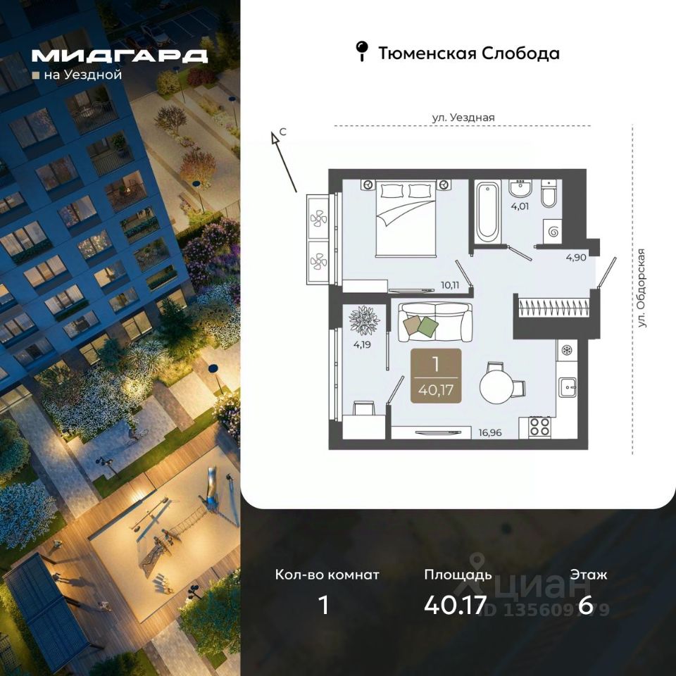 Продается 1-комн. квартира от застройщика в ЖК "Мидгард на Уездной" на 6 этаже. Квартира без отделки, после оформления собственности можно делать ремонт. Общая площадь: 40.17 кв.м., жилая: 10.11 кв.м., площадь просторной кухни-столовой: 16.96 кв.м. Все окна выходят на одну сторону. В квартире одна лоджия, один совмещенный санузел. Высота потолков 2.72 м.