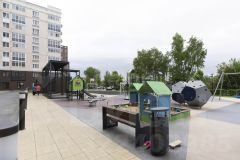 Дворовая территория огорожена , оборудована яркой современной детской площадкой и зоной отдыха.