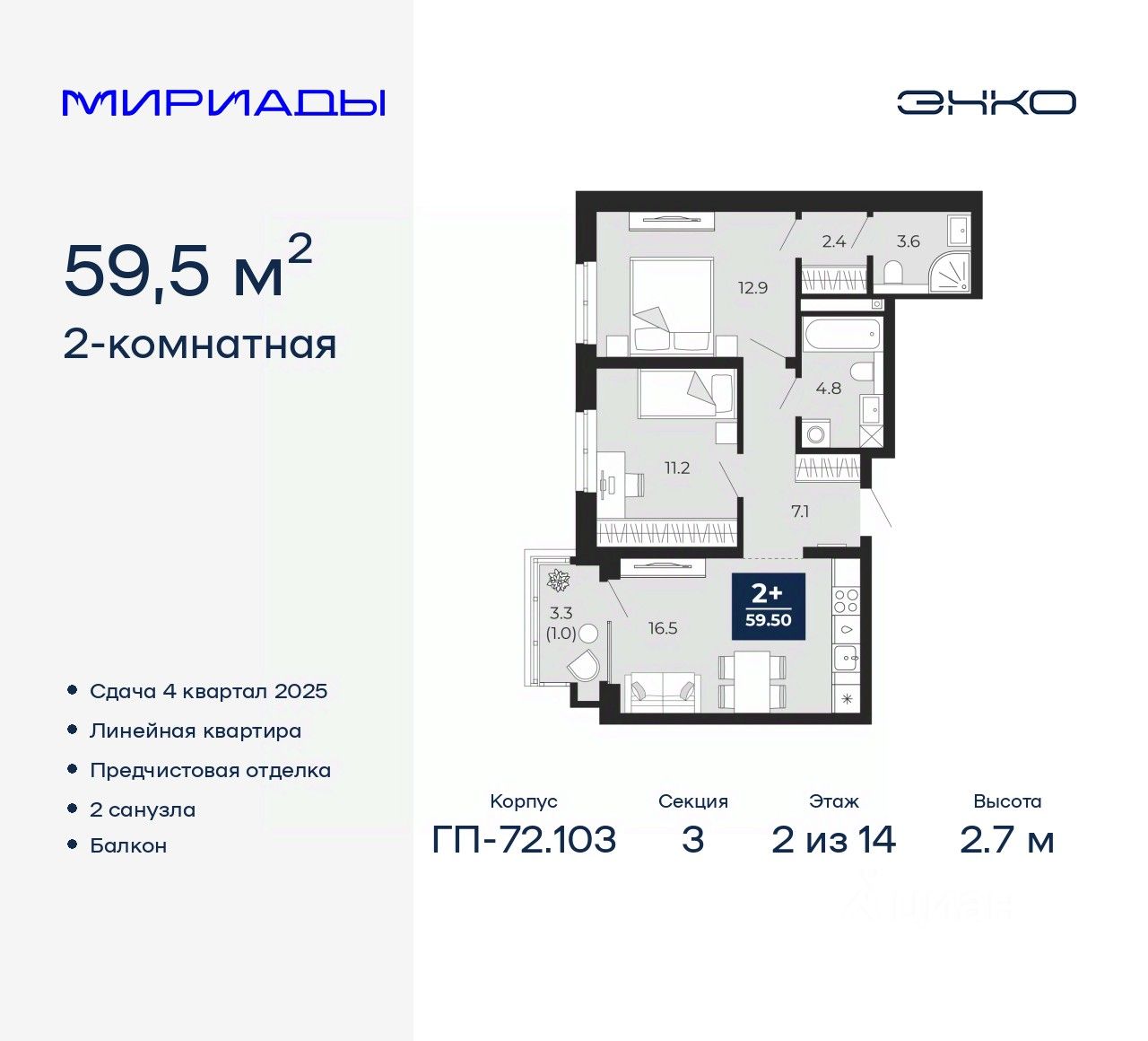 2-комн. квартира от застройщика с предчистовой отделкой в ЖК "Мириады" на 2 этаже. Общая площадь: 59.5 кв.м., жилая: 24.1 кв.м., площадь просторной кухни-столовой: 16.5 кв.м. Комнаты изолированные, все окна выходят на одну сторону. В квартире один балкон, два совмещенных санузла. Высота потолков 2.7 м.