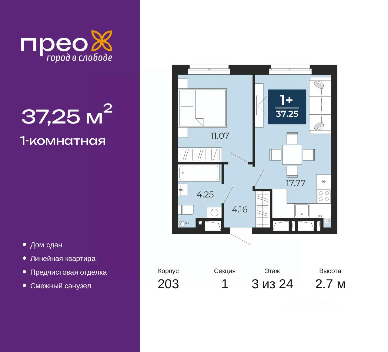 Продается 1-комн. квартира от застройщика с предчистовой отделкой в ЖК "Прео" на 3 этаже. Общая площадь: 37.25 кв.м., жилая: 11.07 кв.м., площадь просторной кухни-столовой: 17.77 кв.м. Все окна выходят на одну сторону. В квартире один совмещенный санузел. Высота потолков 2.7 м.