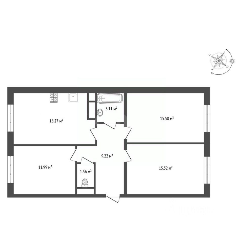 Окна квартиры выходят на две стороны (внутрь двора, и наружу). В каждой комнате будет достаточно место, чтобы реализовать идеи каждого члена семьи. А также большая кухня позволит скоротать время. В доме уже расположен "Магнит", а также пункты приема маркетплейсов!