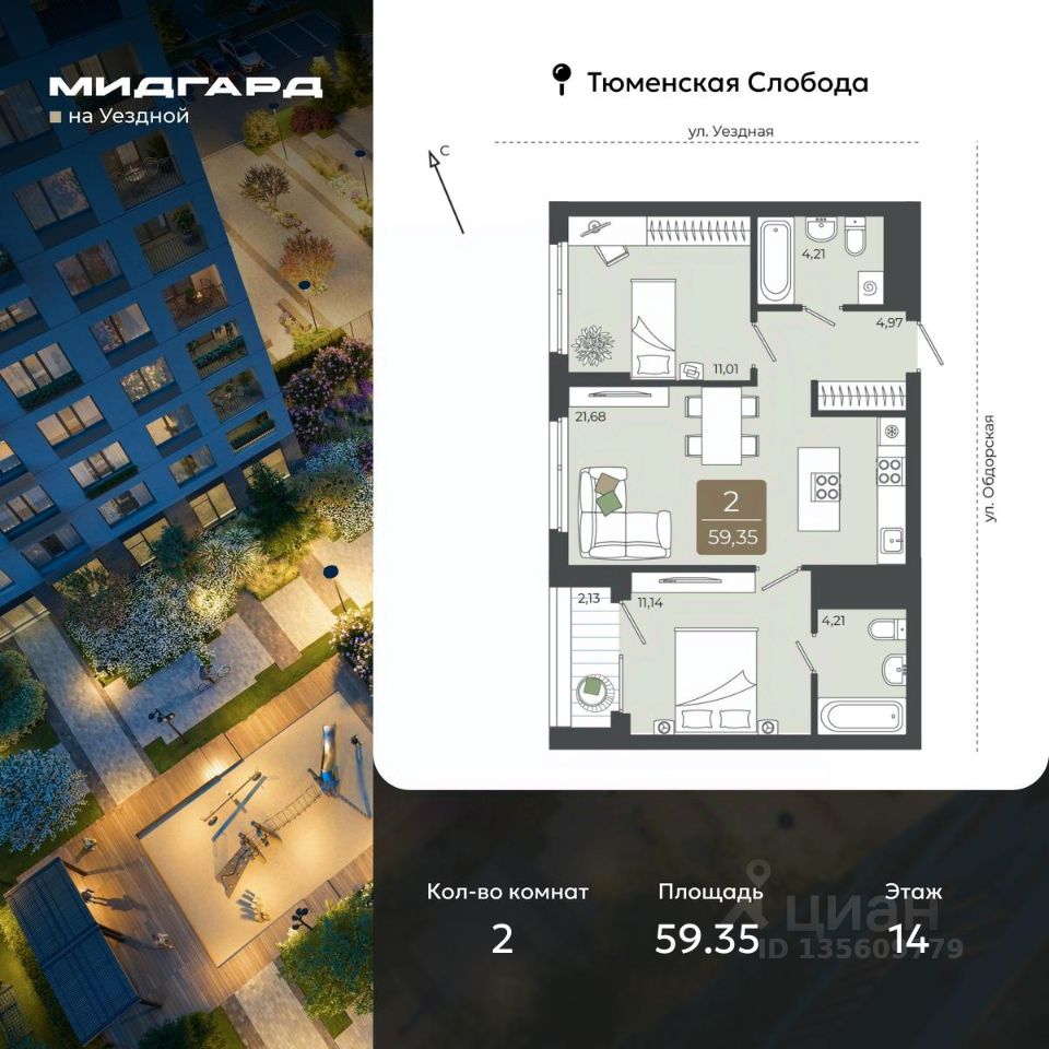 Продается двухкомнатная квартира в ЖК "Мидгард на Уездной" на 14 этаже. Квартира без отделки, новый собственник может сделать ремонт по индивидуальному дизайн-проекту. Общая площадь: 59.35 кв.м., жилая: 22.15 кв.м., площадь просторной кухни-столовой: 21.68 кв.м. Комнаты изолированные, все окна выходят на одну сторону. В квартире одна лоджия, два совмещенных санузла. Высота потолков 2.72 м.