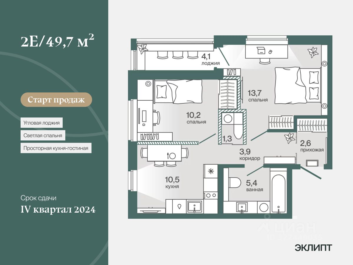 Квартира с угловой лоджией и просторной кухней-гостиной. В отдельной спальне место для рабочей зоны и ниша под шкафы. Дополнительное место хранения — в прихожей.