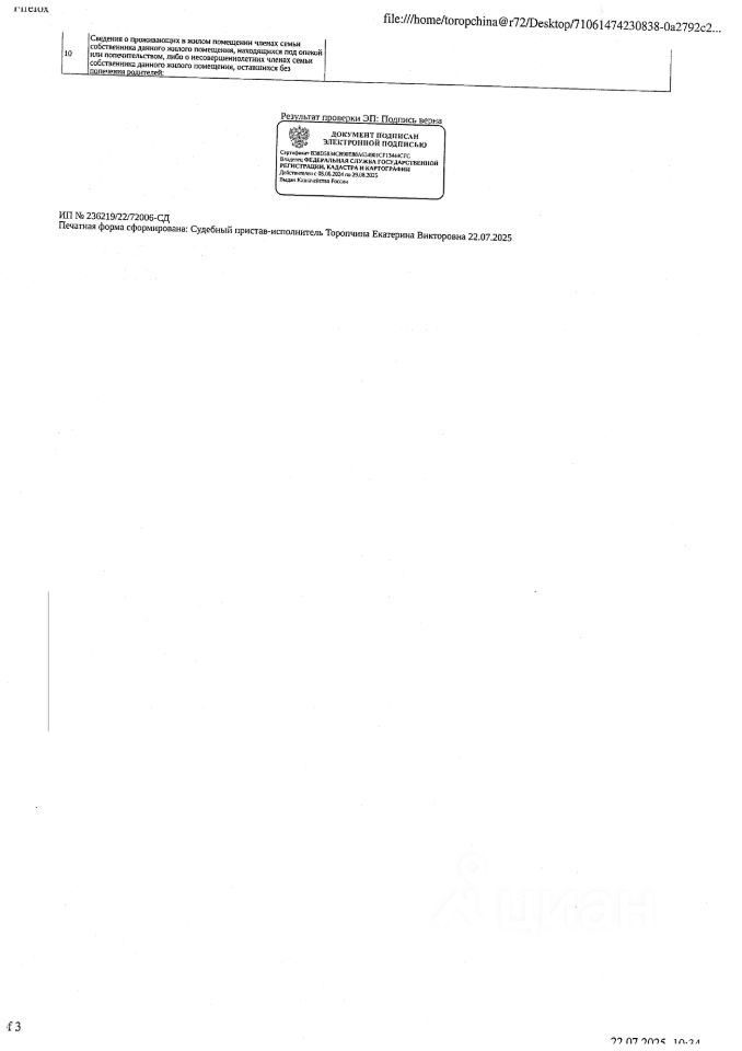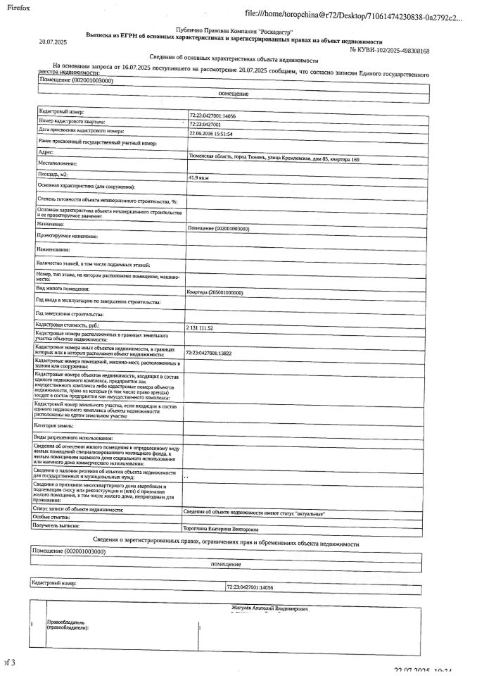 Должник: Жигулёва И.Н., собственник: Жигулёва И.Н., Жигулев А.В. Лот: Жилое помещение (квартира), площадь 41,9 кв.м., кадастровый номер: 72:23:0427001:14056, г. Тюмень, ул. Кремлевская, д. 85, кв. 169, (зарегистрированные лица - отсутствуют, задолженность за кап.ремонт на 18.07.25 - 36 т.р.), н/ц: 2958680 р., з-к: 2958 р, код: 0014, рег. 72-009841;