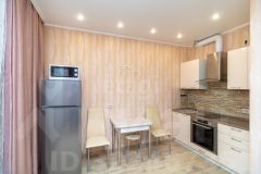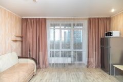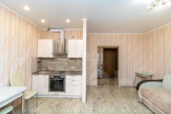 В квартире выполнен качественный ремонт: на полу уложен ламинат. В квартире имеется удобное спальное место — раскладывающийся диван на две персоны. В прихожей на полу керамогранит. Для хранения большой встроенный шкаф-купе. В кухне установлен кухонный гарнитур с варочной панелью и обеденный стол. Санузел совмещен, оборудован всем необходимым. Просторная лоджия с ламинатом и встроенным шкафом.