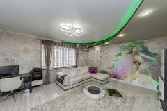 Одним из ярких акцентов квартиры является встроенный в стену аквариум с боковыми пузырьковыми панелями, который станет настоящим украшением вашего интерьера и создаст атмосферу спокойствия и гармонии.