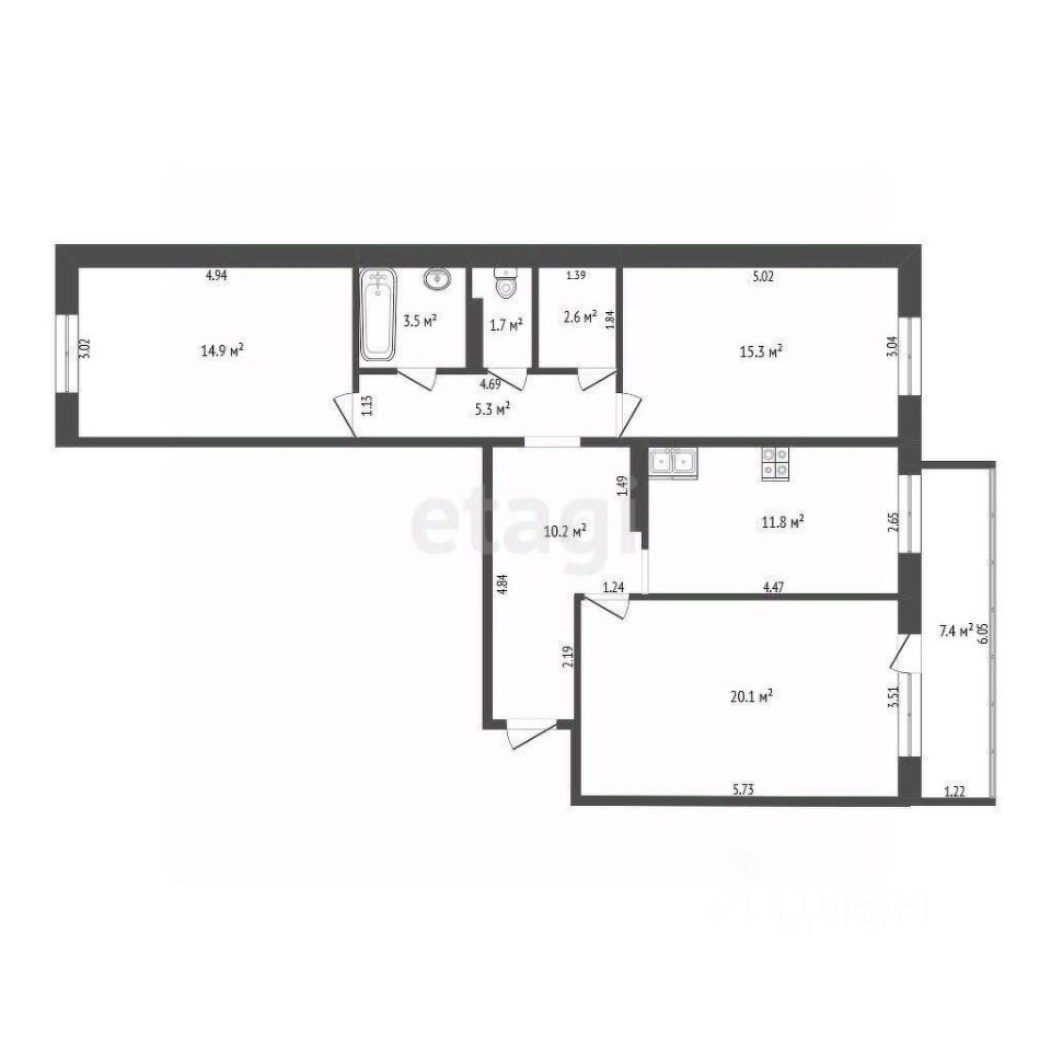 - Планировка: кухня 11.8 кв.м., 3 изолированные комнаты (20 кв.м.,15.3 кв.м., 14.9 кв.м.), одна из них с выходом на просторный балкон 7 кв.м., раздельный санузел, гардеробная 2.6 кв.м.
