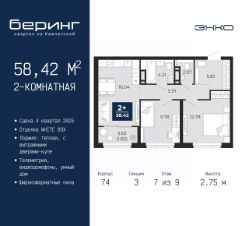 2-комн. квартира в ЖК "Беринг" на 7 этаже. Квартира без отделки, новый собственник может сделать ремонт по своему дизайн-проекту. Общая площадь: 58.42 кв.м., жилая: 22.56 кв.м., площадь просторной кухни-столовой: 16.04 кв.м. Комнаты изолированные, все окна выходят на одну сторону. В квартире одна лоджия, один совмещенный и один раздельный санузел. Высота потолков 2.75 м.