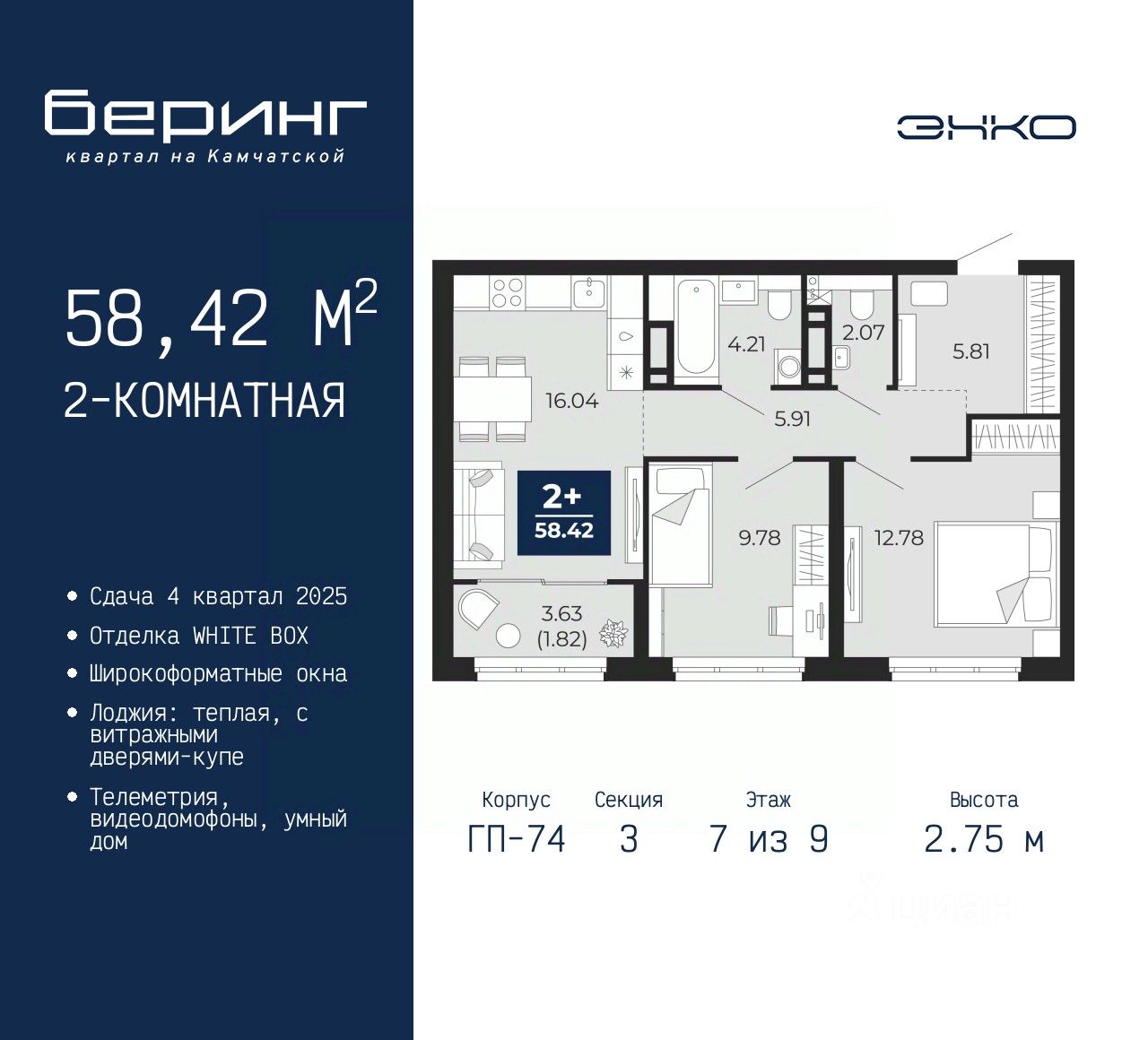 Двухкомнатная квартира в ЖК "Беринг" на 7 этаже. Квартира без отделки, после оформления собственности можно делать ремонт. Общая площадь: 58.42 кв.м., жилая: 22.56 кв.м., площадь просторной кухни-столовой: 16.04 кв.м. Комнаты изолированные, все окна выходят на одну сторону. В квартире одна лоджия, один совмещенный и один раздельный санузел. Высота потолков 2.75 м.