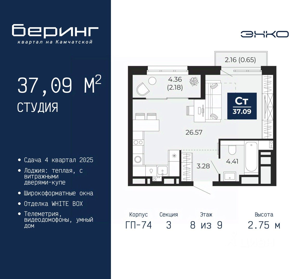 Просторная однокомнатная квартира-студия в ЖК "Беринг" на 8 этаже. Квартира без отделки, после оформления собственности можно делать ремонт. Общая площадь: 37.09 кв.м., площадь гостиной 26.57 кв.м., из которых 5 кв.м. выделено под кухонную зону. Все окна выходят на одну сторону. В квартире один балкон и одна лоджия, один совмещенный санузел. Высота потолков 2.75 м.