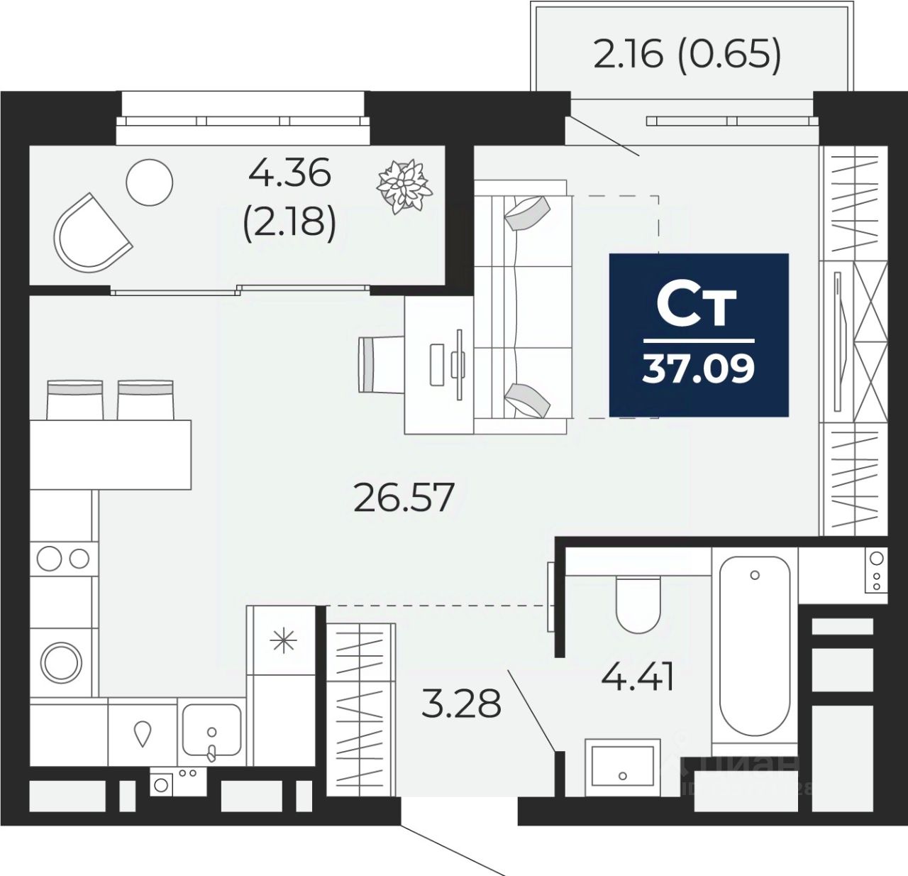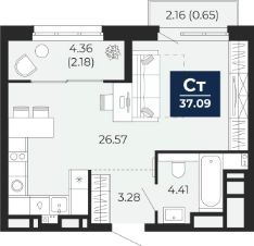 1-комн. квартира-студия в ЖК "Беринг" на 7 этаже. Квартира без отделки, полностью готова к ремонту. Общая площадь: 37.09 кв.м., площадь гостиной 26.57 кв.м., из которых 5 кв.м. выделено под кухонную зону. Все окна выходят на одну сторону. В квартире один балкон и одна лоджия, один совмещенный санузел. Высота потолков 2.75 м.