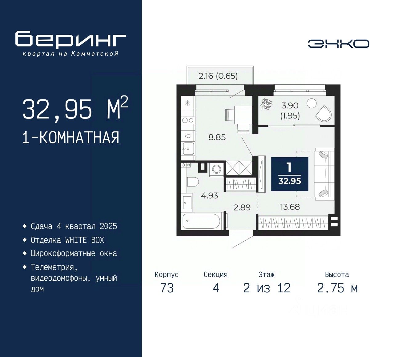 Однокомнатная квартира от застройщика в ЖК "Беринг" на 2 этаже. Квартира без отделки, после выдачи ключей можно делать ремонт. Общая площадь: 32.95 кв.м., жилая: 13.68 кв.м., площадь кухни: 8.85 кв.м. Все окна выходят на одну сторону. В квартире один балкон и одна лоджия, один совмещенный санузел. Высота потолков 2.75 м.