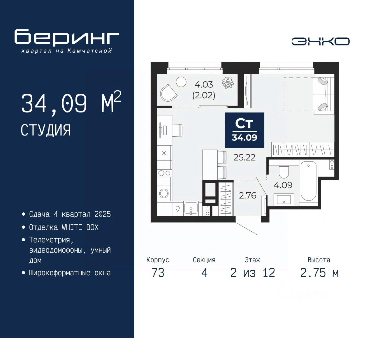 1-комн. квартира-студия от застройщика в ЖК "Беринг" на 2 этаже. Квартира без отделки, новый владелец может сделать ремонт по своему дизайн-проекту. Общая площадь: 34.09 кв.м., площадь гостиной 25.22 кв.м., из которых 5 кв.м. выделено под кухонную зону. Все окна выходят на одну сторону. В квартире один совмещенный санузел. Высота потолков 2.75 м.