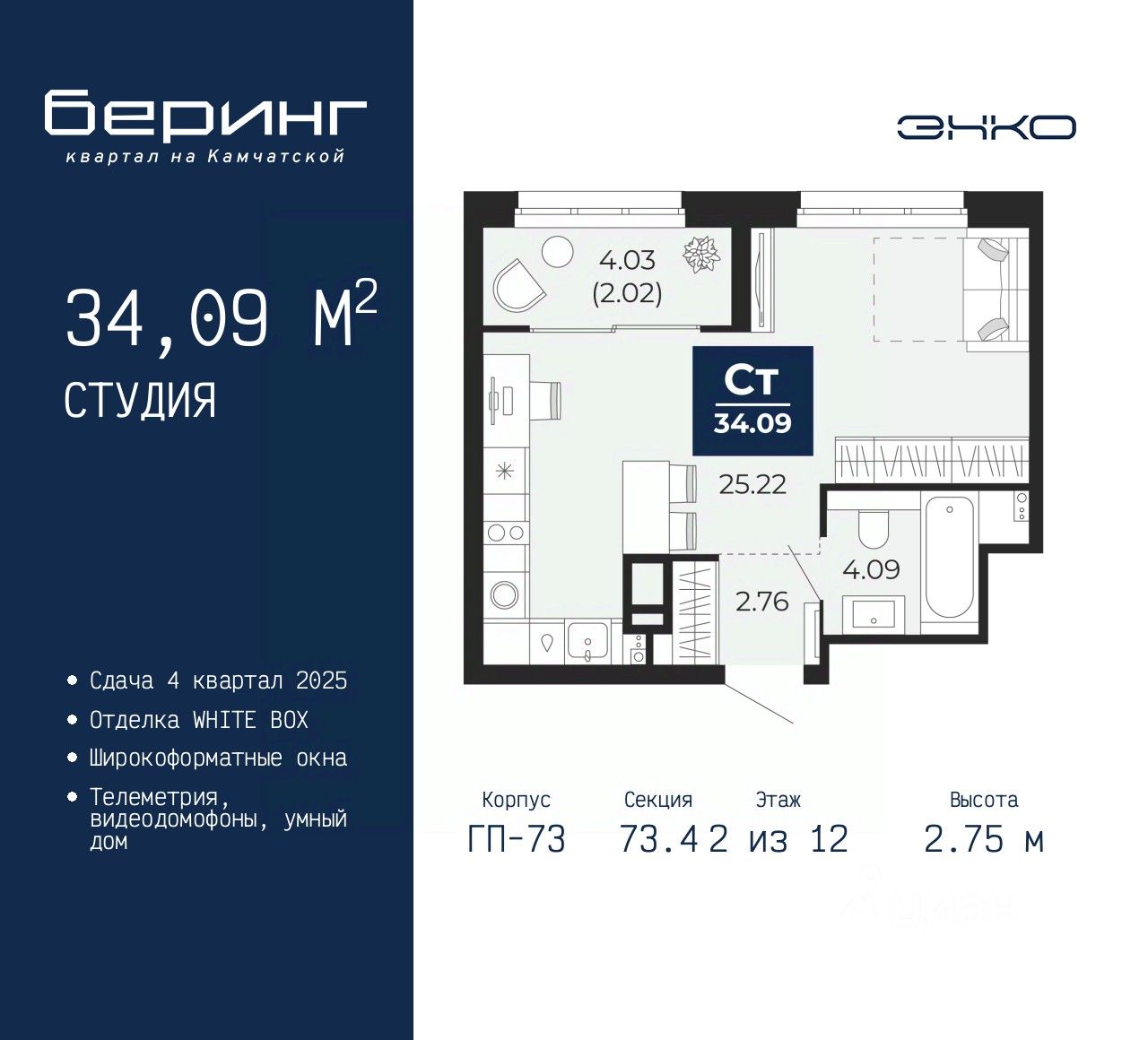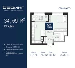 1-комн. квартира-студия в ЖК "Беринг" на 2 этаже. Квартира без отделки, полностью готова к ремонту. Общая площадь: 34.09 кв.м., площадь гостиной 25.22 кв.м., из которых 5 кв.м. выделено под кухонную зону. Все окна выходят на одну сторону. В квартире один совмещенный санузел. Высота потолков 2.75 м.