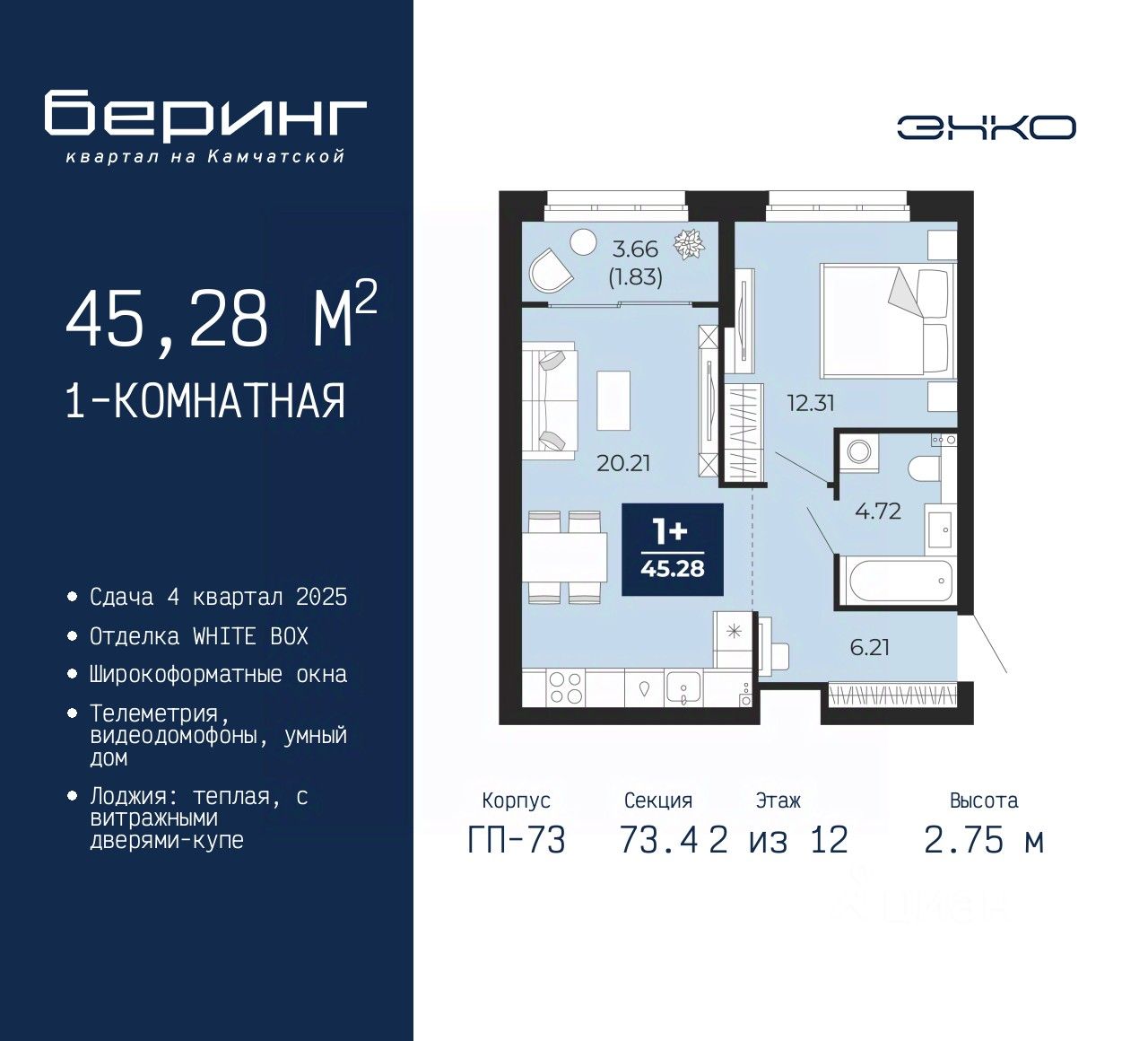 Просторная 1-комн. квартира в ЖК "Беринг" на 2 этаже. Квартира без отделки, новый собственник может сделать ремонт по своему дизайн-проекту. Общая площадь: 45.28 кв.м., жилая: 12.31 кв.м., площадь просторной кухни-столовой: 20.21 кв.м. Все окна выходят на одну сторону. В квартире одна лоджия, один совмещенный санузел. Высота потолков 2.75 м.