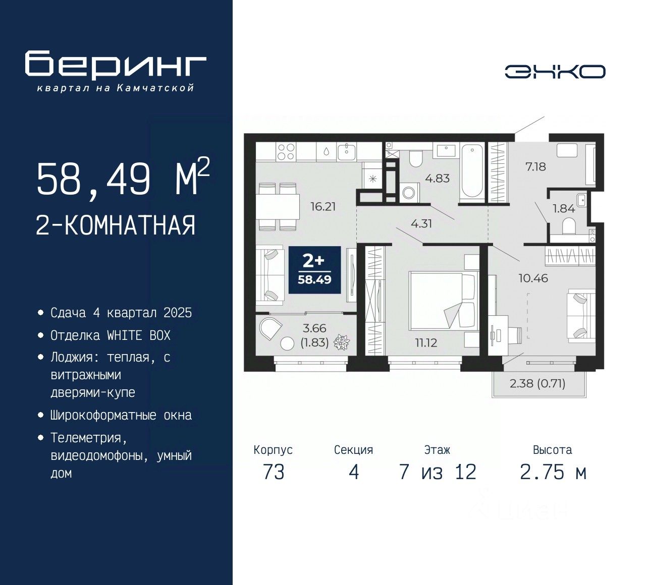 Двухкомнатная квартира в ЖК "Беринг" на 7 этаже. Квартира без отделки, новый собственник может сделать ремонт по своему дизайн-проекту. Общая площадь: 58.49 кв.м., жилая: 21.58 кв.м., площадь просторной кухни-столовой: 16.21 кв.м. Комнаты изолированные, все окна выходят на одну сторону. В квартире один балкон и одна лоджия, один совмещенный и один раздельный санузел. Высота потолков 2.75 м.