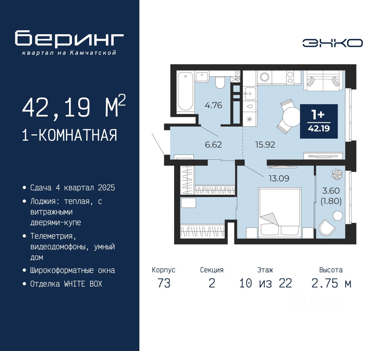 Продается 1-комн. квартира от застройщика в ЖК "Беринг" на 10 этаже. Квартира без отделки, полностью готова к чистовой отделке и дальнейшему ремонту. Общая площадь: 42.19 кв.м., жилая: 13.09 кв.м., площадь просторной кухни-столовой: 15.92 кв.м. Все окна выходят на одну сторону. В квартире одна лоджия, один совмещенный санузел. Высота потолков 2.75 м.