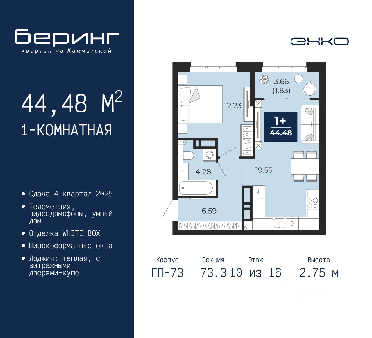 1-комн. квартира в ЖК "Беринг" на 10 этаже. Квартира без отделки, новый собственник может сделать ремонт по своему дизайн-проекту. Общая площадь: 44.48 кв.м., жилая: 12.23 кв.м., площадь просторной кухни-столовой: 19.55 кв.м. Все окна выходят на одну сторону. В квартире одна лоджия, один совмещенный санузел. Высота потолков 2.75 м.