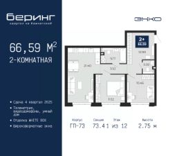 2-комн. квартира от застройщика в ЖК "Беринг" на 1 этаже. Квартира без отделки, после выдачи ключей можно делать ремонт. Общая площадь: 66.59 кв.м., жилая: 21.58 кв.м., площадь просторной кухни-столовой: 21.4 кв.м. Комнаты изолированные, все окна выходят на одну сторону. В квартире один совмещенный и один раздельный санузел. Высота потолков 2.75 м.