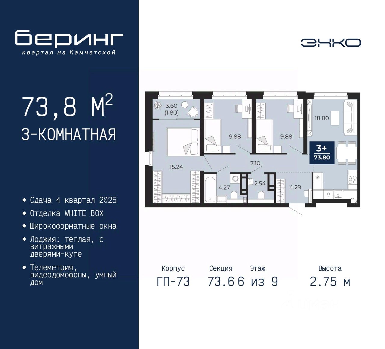 3-комн. квартира от застройщика в ЖК "Беринг" на 6 этаже. Квартира без отделки, полностью готова к ремонту. Общая площадь: 73.8 кв.м., жилая: 35 кв.м., площадь просторной кухни-столовой: 18.8 кв.м. Угловая квартира, идеально подойдет любителям тишины и панорамных видов. В квартире одна лоджия, один совмещенный и один раздельный санузел. Высота потолков 2.75 м.