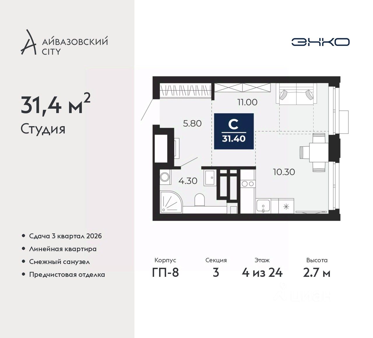 1-комн. квартира-студия с предчистовой отделкой в ЖК "Айвазовский City" на 4 этаже. Общая площадь: 31.4 кв.м., площадь гостиной 21.3 кв.м., из которых 10.3 кв.м. выделено под кухонную зону. Все окна выходят на одну сторону. В квартире один совмещенный санузел. Высота потолков 2.7 м.