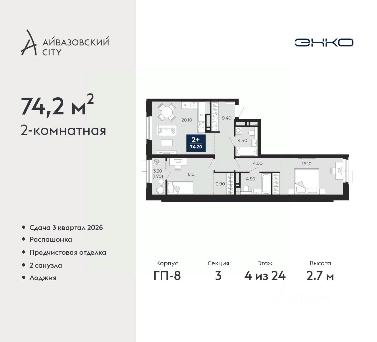 2-комн. квартира с предчистовой отделкой в ЖК "Айвазовский City" на 4 этаже. Общая площадь: 74.2 кв.м., жилая: 28 кв.м., площадь просторной кухни-столовой: 20.1 кв.м. Квартира - распашонка, без проходных комнат, окна выходят на paзные стороны дома. В квартире одна лоджия, два совмещенных санузла. Высота потолков 2.7 м. Дом монолитный, многоподъездный, переменной этажности, от 14 до 24 этажей. Квартира находится в 3-й секции высотой 24 этажа в корпусе ГП-8. На этаже 7 квартир. В подъезде 1 пассажирский и 1 грузовой лифт. Окончание строительства - 3 квартал 2026 года. Оформление сделки по договору долевого участия. Новый жилой район располагается в живописном месте на берегу Туры в центральной части города. Принципиально новое пространство для жизни в центре современного города для тех, чьи мечты сбываются, кто нацелен на постоянный рост, перемены к лучшему для себя и своих близких. Каждая деталь Айвазовский City вдохновляет и заряжает на новые свершения: авторская архитектура, сбалансированная продуманная инфраструктура, дизайнерские дворы со спортивными и детскими площадками, парковые зоны с фонтанами, водный канал, украшающий центральный прогулочный маршрут района и многое другое. В 2019 года проект стал лауреатом престижной премии Urban Awards 2019 в номинации "Лучший строящийся региональный жилой комплекс бизнес-класса". Главная особенность Айвазовский City - соседство разных архитектурных школ в рамках одного дома. Изысканная классика, выразительная эклектика и оригинальный модерн - жить в одном из таких домов настоящий повод для гордости. Айвазовский City это идеальное сочетание комфорта, технологий и развитой инфраструктуры. Вход в подъезд возможен с улицы и со двора. Отправляясь на работу или за покупками, жители могут выйти с внешней стороны дома, а для прогулки с ребенком со стороны двора. Экологически чистые материалы и энергосберегающие технологии, качественное освещение общественных зон, видеонаблюдение по всей территории жилого района (в том числе в подъездах, лифтах и в подземном паркинге), закрытые дворы с доступом только для жителей Айвазовский City. Часть домов в Айвазовский City будут оснащены подземным паркингом. Востребованный в нашем климатическом поясе формат хранения автомобилей защитит собственность владельца в любое время года. Аккредитация в банках: ПАО "Газпромбанк", ПАО Банк "ВТБ", ОАО "Альфа-Банк", "Сбербанк России", ПАО Банк "ФК Открытие" и других. #ZMsF9g