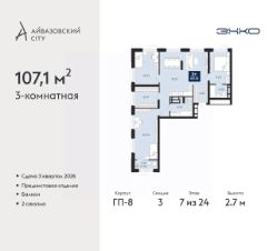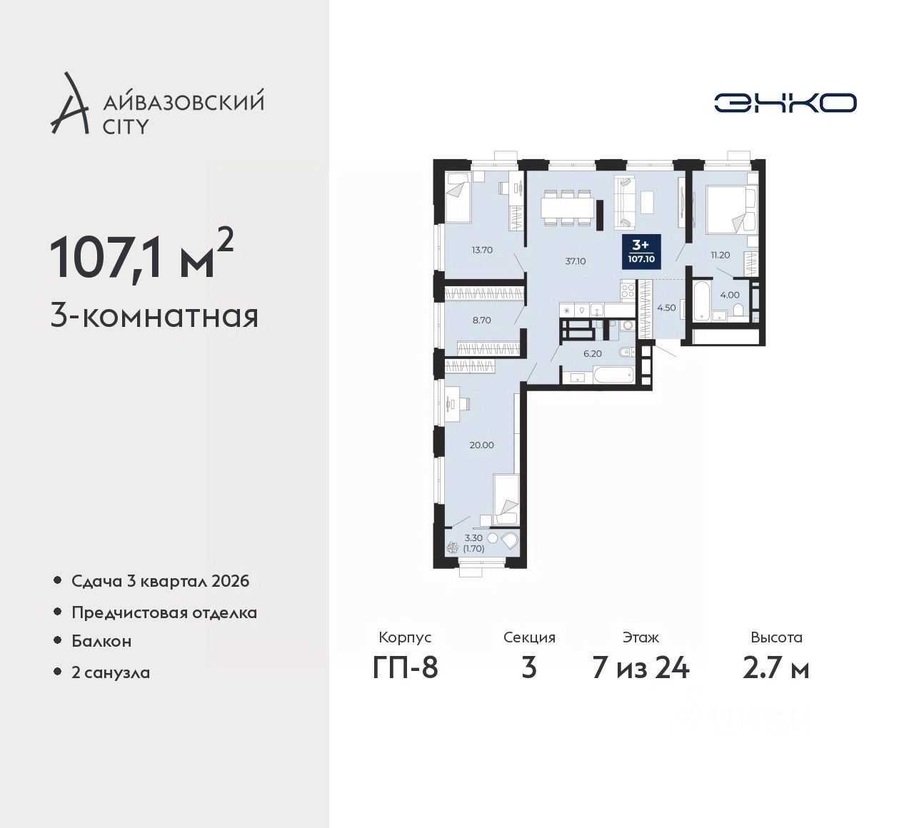 Трехкомнатная квартира с предчистовой отделкой в ЖК "Айвазовский City" на 7 этаже. Общая площадь: 107.1 кв.м., жилая: 44.9 кв.м., площадь просторной кухни-столовой: 37.1 кв.м. Квартира без проходных комнат, окна выходят нa три cтopoны дома. В квартире один балкон, два совмещенных санузла. Высота потолков 2.7 м.
