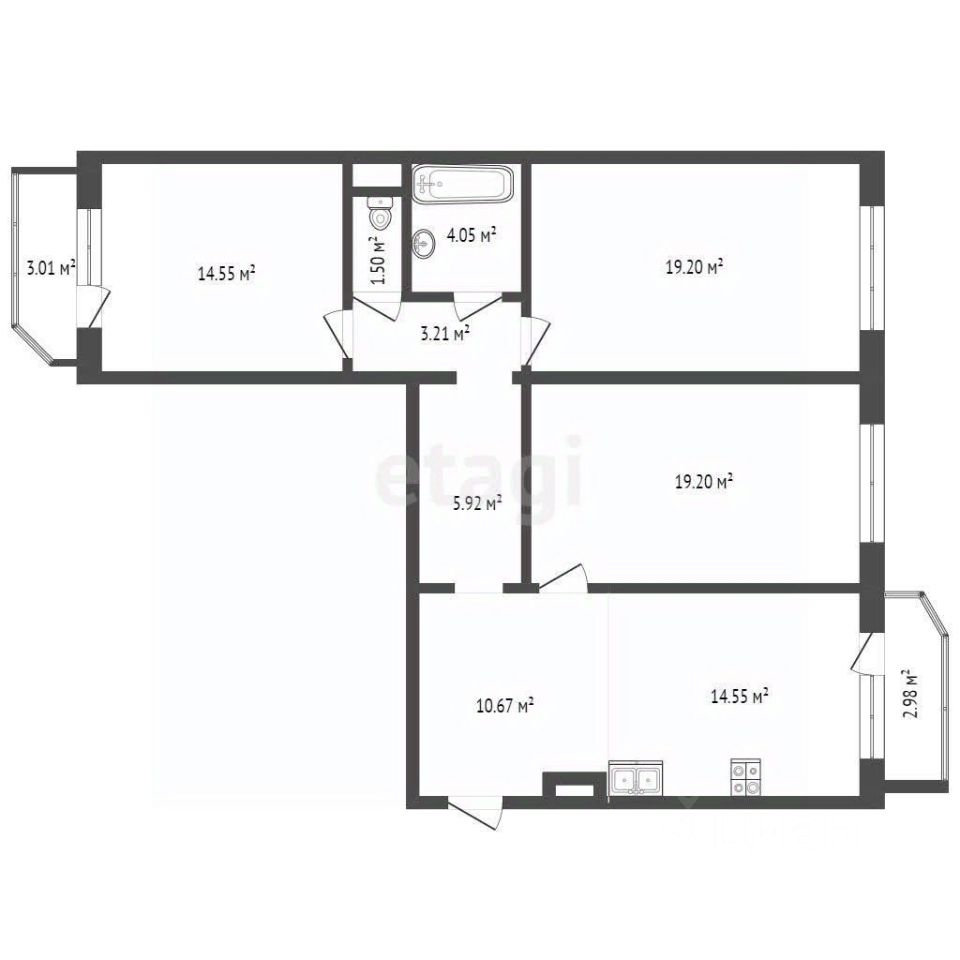 В квартире три комнаты площадью 15-19-19 кв.м., кухня-гостиная 15 кв.м., два балкона по 3 кв.м., раздельный санузел.