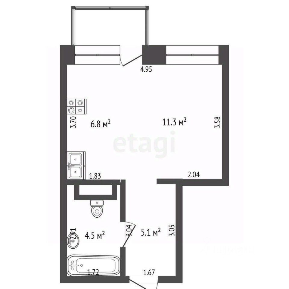 В студии 2 больших панорамных окна, что обеспечивает дополнительный комфорт и превосходное естественное освещение. Также можно зонировать комнату.