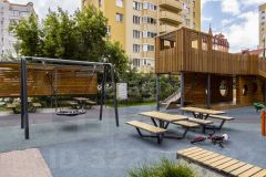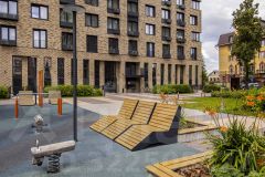 Цветовая гамма фасадов и общественных мест представлена в теплых оттенках.