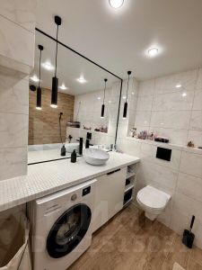 - Ванная: теплый пол, стиралка под столешницей, зеркало во всю стену столешница для 1001 мелочи.