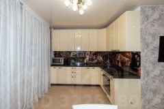 Просторная и светлая кухня-гостиная станет идеальным местом для встреч с друзьями. Кухонный гарнитур выполнен из качественных материалов: столешница из искусственного камня, стеновая панель (фартук) стекло с фотопечатью.