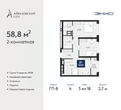 Продается двухкомнатная квартира с предчистовой отделкой в ЖК "Айвазовский City" на 3 этаже. Общая площадь: 58.8 кв.м., жилая: 25 кв.м., площадь просторной кухни-столовой: 16 кв.м. Комнаты изолированные, все окна выходят на одну сторону. В квартире одна лоджия, два совмещенных санузла. Высота потолков 2.7 м.