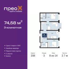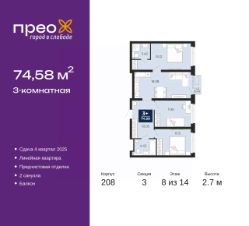 3-комн. квартира с предчистовой отделкой в ЖК "Прео" на 8 этаже. Общая площадь: 74.58 кв.м., жилая: 37.88 кв.м., площадь просторной кухни-столовой: 18.38 кв.м. Комнаты изолированные, все окна выходят на одну сторону. В квартире один балкон, два совмещенных санузла. Высота потолков 2.7 м.