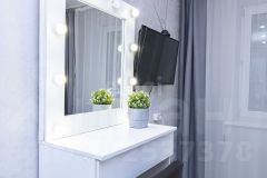 — Небольшая современная кухня —Холодильник и телевизор, -Шкаф для одежды, стиральная машина — Удобный просторный диван для отдыха — Изящный косметический столик с зеркалом и креслом