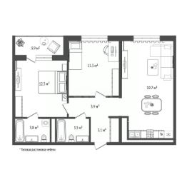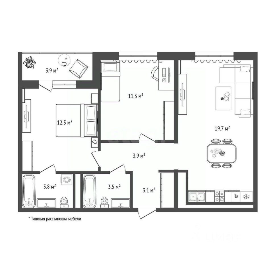 Планировка точная и разумная — как хороший мотив: просторная кухнягостиная 19,7 м², где удобно собирать гостей и одновременно готовить, две правильной формы комнаты 12,3 и 11,3 м² — одна из них легко становится мастерспальней, другая — детской или камерным кабинетом. Два санузла (приблизительно 3,8 и 3,5 м²) — редкая приятность в городской квартире; лоджия/балкон 3,9 м² даёт дополнительную интимную террасунишу для растений и утра с чашкой кофе. Прихожие и ниши продуманы для хранения — место для аккуратного гардероба и техники, ничего не мешает глазу и движению. Планировка по сути — "игра на контрастах": простор для общения и уют для уединения, всё по правилам современной жизни.