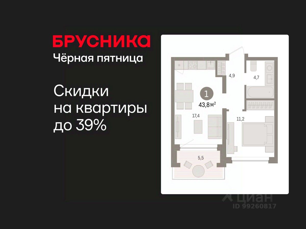 Квартира с кухней-гостиной и одной спальней в Доме у озера. Особенности планировки: вид во двор, предчистовая отделка, балкон.