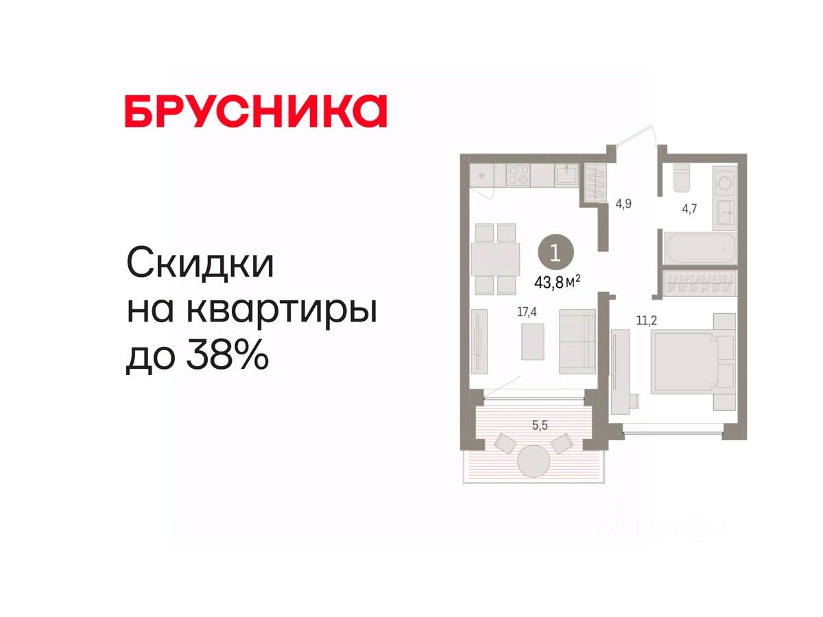 Квартира с кухней-гостиной и одной спальней в Доме у озера. Особенности планировки: балкон, вид во двор, предчистовая отделка.