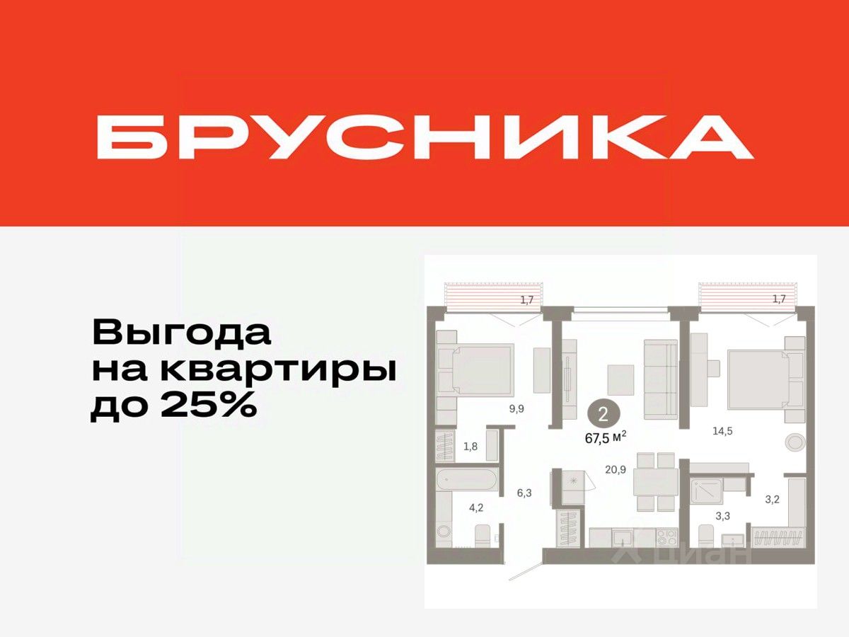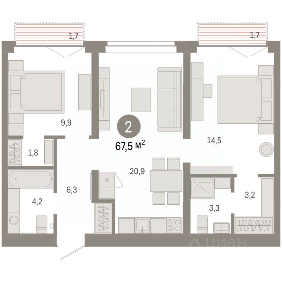 Продается двухкомнатная квартира с предчистовой отделкой в ЖК "Республики 205" на 3 этаже. Общая площадь: 67.52 кв.м., жилая: 24.4 кв.м., площадь просторной кухни-гостиной: 20.9 кв.м. Комнаты изолированные, все окна выходят на одну сторону. В квартире два балкона, два совмещенных санузла. Высота потолков 2.7 м.