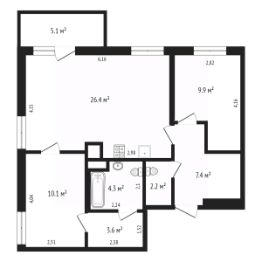 2к, 63,9м² (5,1м² балкон, общая 69м²)