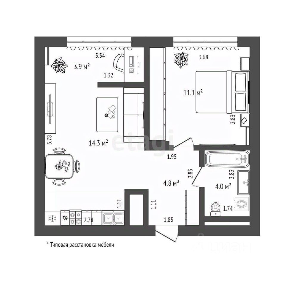 Квартира 1к, 34.2 кв.м. на 13-м этаже.
