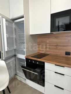 В гостиной установлен стильный кухонный гарнитур со встроенной техникой : холодильник, варочная панель, духовой шкаф, вытяжка, сплит система. Обеденный стол, стулья, диван. Выделена зона ТВ. В спальной зоне разместилась просторная кровать с подъемным механизмом.