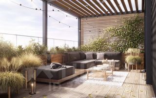 Планировка однокомнатная. В спальне есть место не только для отдыха, но и для рабочей зоны. Здесь же выход на террасу — можете разместить там летнюю мебель и шезлонги, чтобы отдыхать на свежем воздухе, когда тепло. Приятный бонус — гардеробная в спальне.