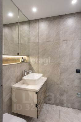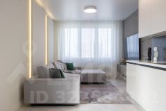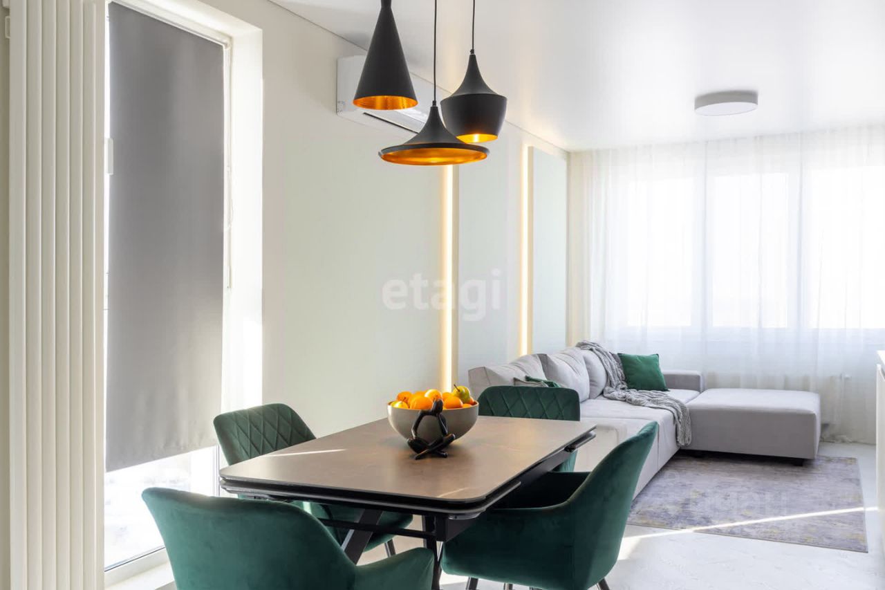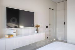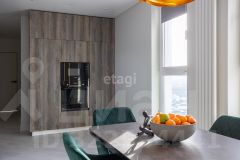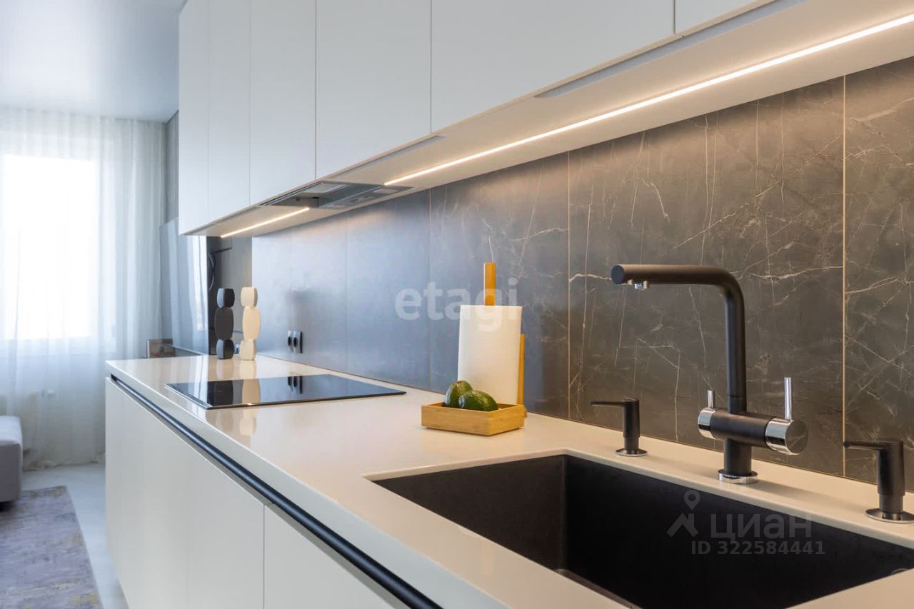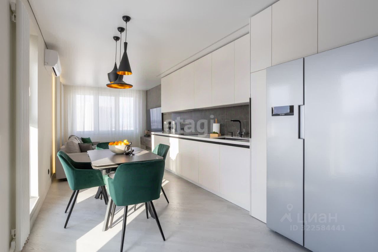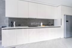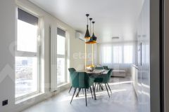 На кухне установлен стильный гарнитур с каменой столешницей и раковиной из керамогранита. Вся бытовая техника от ведущего мирового производителя Bosch делает жизнь в этой квартире максимально удобной. Панорамные окна наполняют помещение светом, открывая живописный вид на окрестности. Стены покрашены в мягкие оттенки, а натяжные потолки создают ощущение простора.