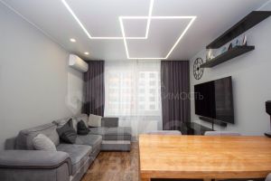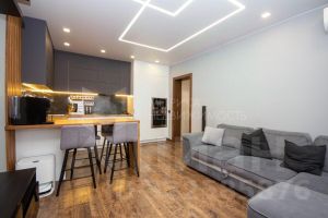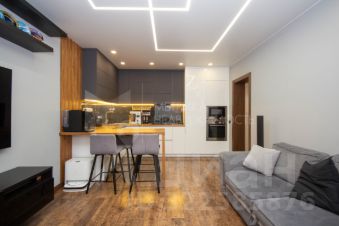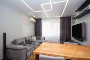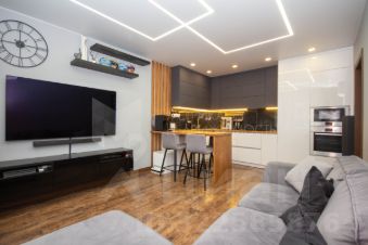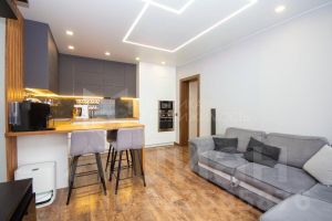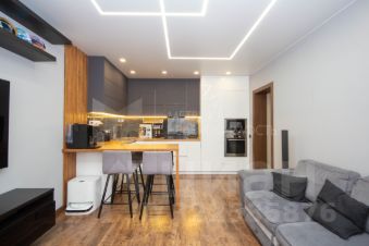 В квартире сделан качественный, современный ремонт с элементами натурального дерева. Стены под покраску, натяжной потолок, качественный ламинат/плитка на полу в ванной с подогревом. На балконе уложен кварцвинил с подогревом (терморегуляторы).
