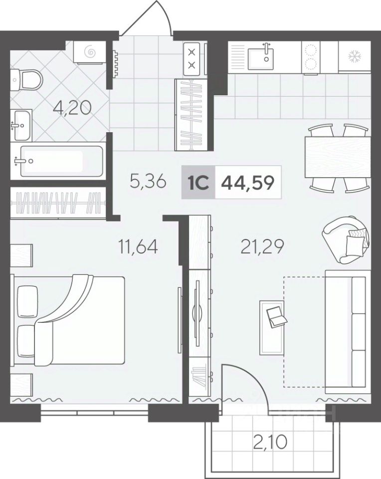 Уютная однокомнатная квартира 44.59 кв.м на 3 этаже. Функциональная планировка позволяет удобно организовать быт, а кухня-гостиная подойдёт для отдыха и общения.