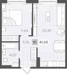 Однокомнатная квартира 41.65 кв.м на 3 этаже с продуманной планировкой. Просторная кухня-гостиная идеально подходит для приёма гостей, а уютная спальня станет личным местом отдыха.