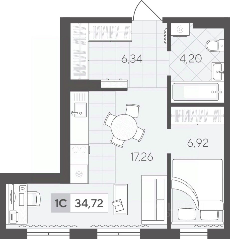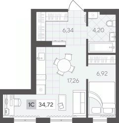 Однокомнатная квартира 34.72 кв.м на 4 этаже с просторной кухней-гостиной. Здесь легко создать уютное пространство для встреч, а отдельная спальня обеспечивает комфорт и личное пространство..