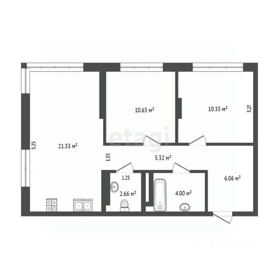 Общая площадь 58.4 кв.м. Кухня-гостиная 21кв.м. с окном и витражной угловым окном в пол, 2 комнаты по 11 кв.м. Все комнаты правильной квадратной формы, а значит удобно можно расставить мебель.